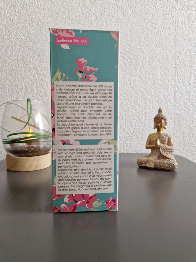 Alliez élégance et praticité avec cette canette isotherme de 500 ml, parfaite pour accompagner votre quotidien. Son design vintage et romantique apporte une touche de raffinement, tandis que sa double paroi en acier inoxydable assure une conservation optimale de vos boissons : jusqu'à 5 heures au chaud et 10 heures au frais.