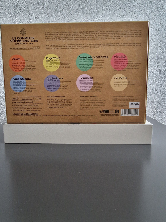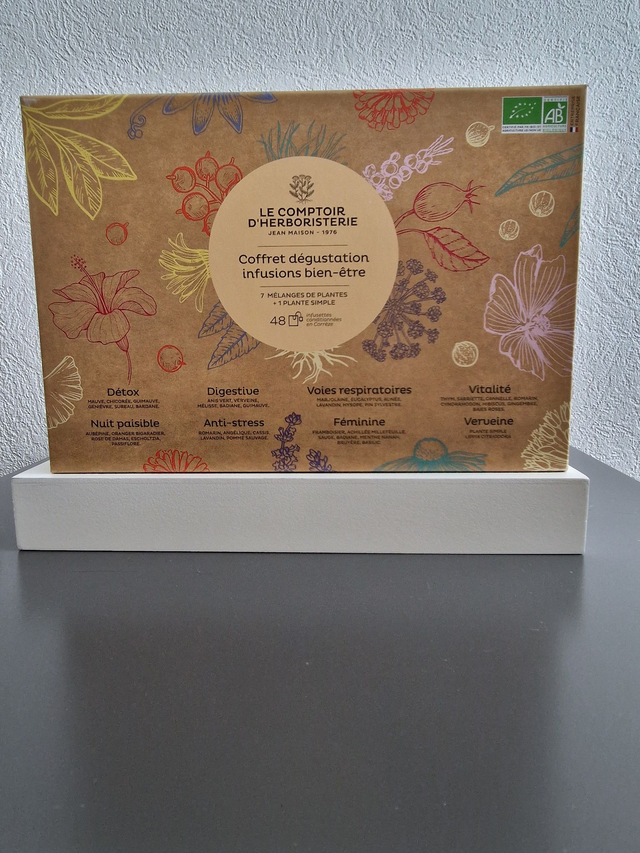 Ce coffret vous permettra de découvrir une sélection de nos compositions : Détox, Digestive, Voies respiratoires, Vitalité, Verveine, Nuit paisible, Anti-stress, Féminine. Il contient 5 infusettes par mélange soit 40 infusettes de 1,2g.