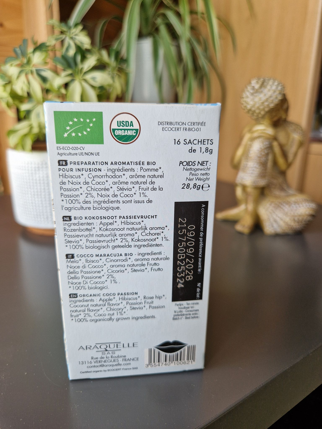 Ingrédients : Pomme bio, Hibiscus bio, Cynorrhodon bio, Arôme naturel de Noix de Coco bio, Arôme naturel de Passion bio, Chicorée bio, Stévia bio, Fruit de la passion bio, Noix de coco bio