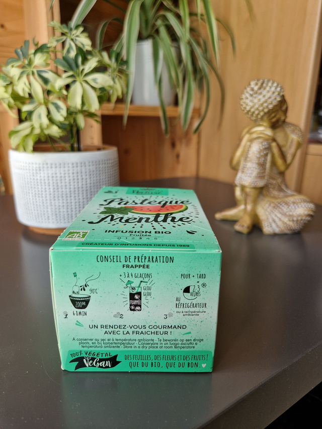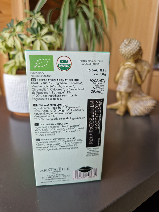 Ingrédients : Rooibos*, Menthe poivrée*, Pomme*, Citronnelle*, Chicorée*, Arôme naturel de pastèque*, Pastèque*