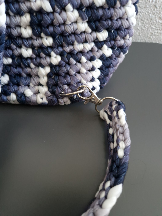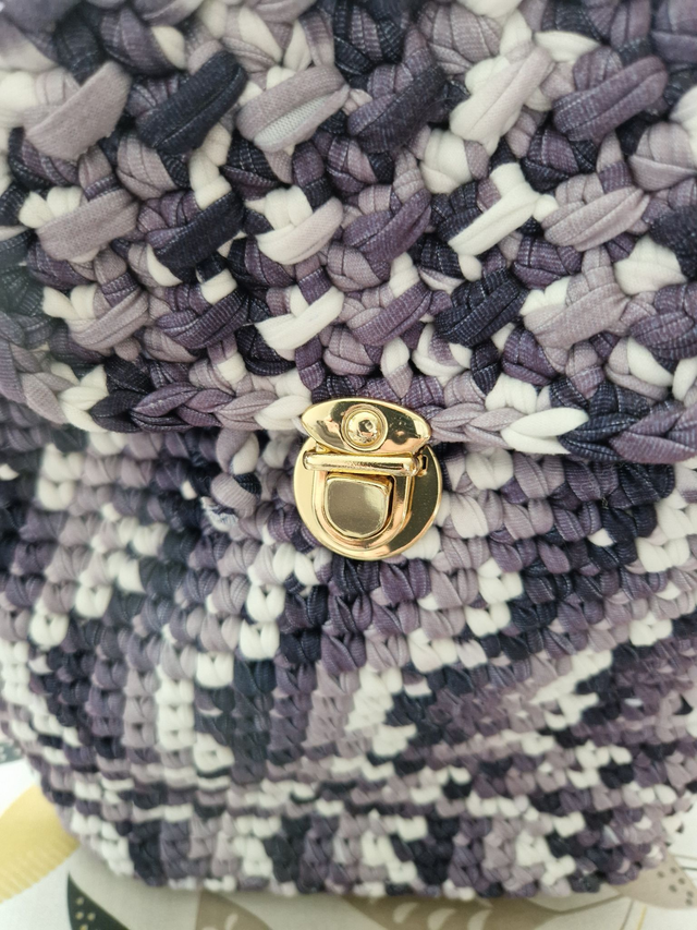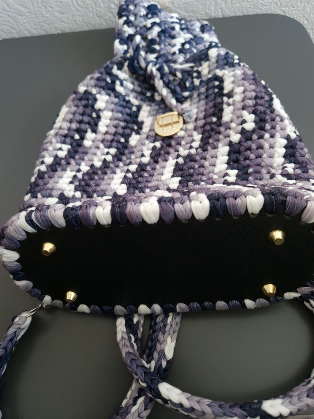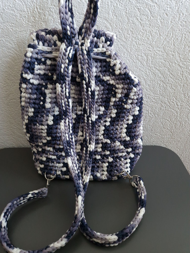 Magnifique sac à dos réalisé entièrement à la main au crochet avec de la laine T-shirt, une matière épaisse, résistante et tendance.