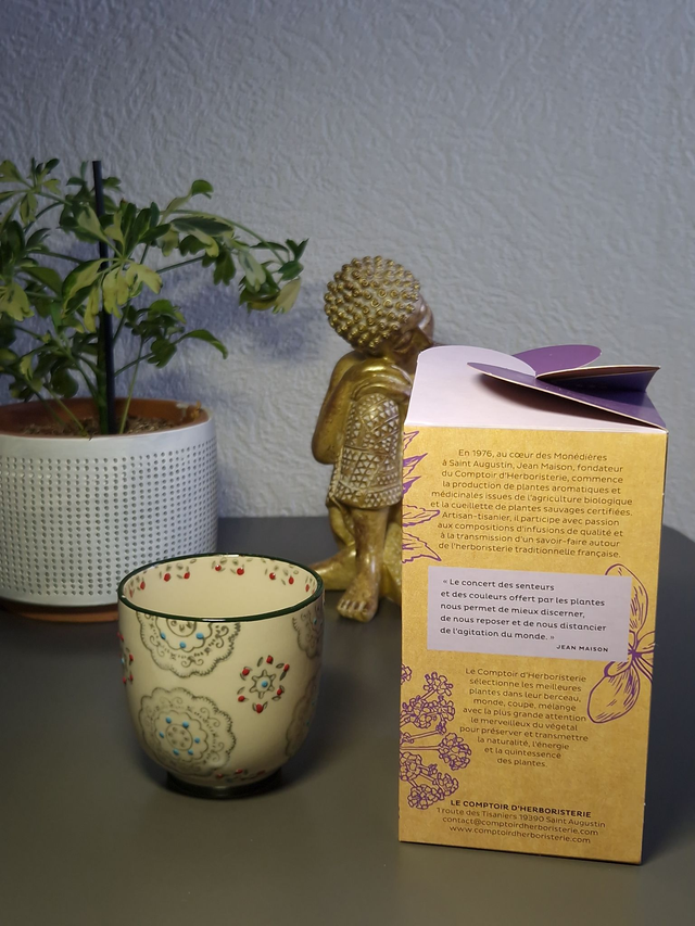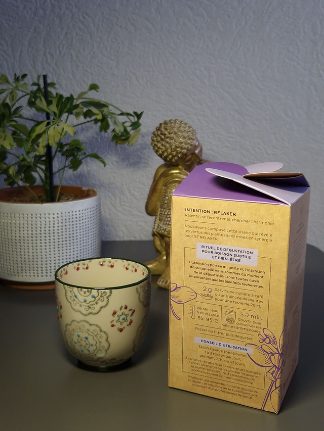 Cette infusion a été composée afin de proposer une alternative au ‘five o'clock’ anglais. Plusieurs personnes nous ont demandé une infusion dont les qualités gustatives s'apparenteraient au thé de 5 heures mais avec un caractère de relaxation. Avec un arôme légèrement caramélisé, elle supporte très bien une édulcoration. Sa composition recherche un équilibre entre une légère amertume, un fumet, une nature un peu tanique ainsi qu'un sentiment de satiété qui permet de favoriser une relaxation en consommant simplement la valeur d'une tasse.